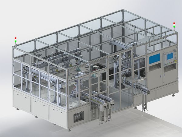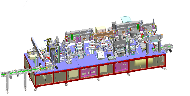 本設備對前道工序提供完工的電池掃碼后進行包膜、折頂?shù)啄z、貼頂蓋絕緣片、尺寸測量、下料掃碼、電池絕緣測試、電池稱重。最后自動下料至輸送帶提供給下道工序的全自動化連線設備,包膜方式兼容U 型和回型包膜兩種方式。