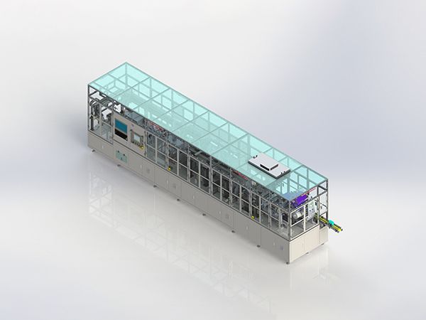 本設備對前道工序提供完工的電池掃碼后進行包膜、折頂?shù)啄z、貼頂蓋絕緣片、尺寸測量、下料掃碼、電池絕緣測試、電池稱重。最后自動下料至輸送帶提供給下道工序的全自動化連線設備,包膜方式兼容U 型和回型包膜兩種方式。